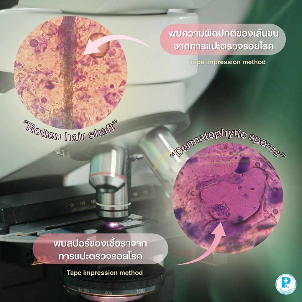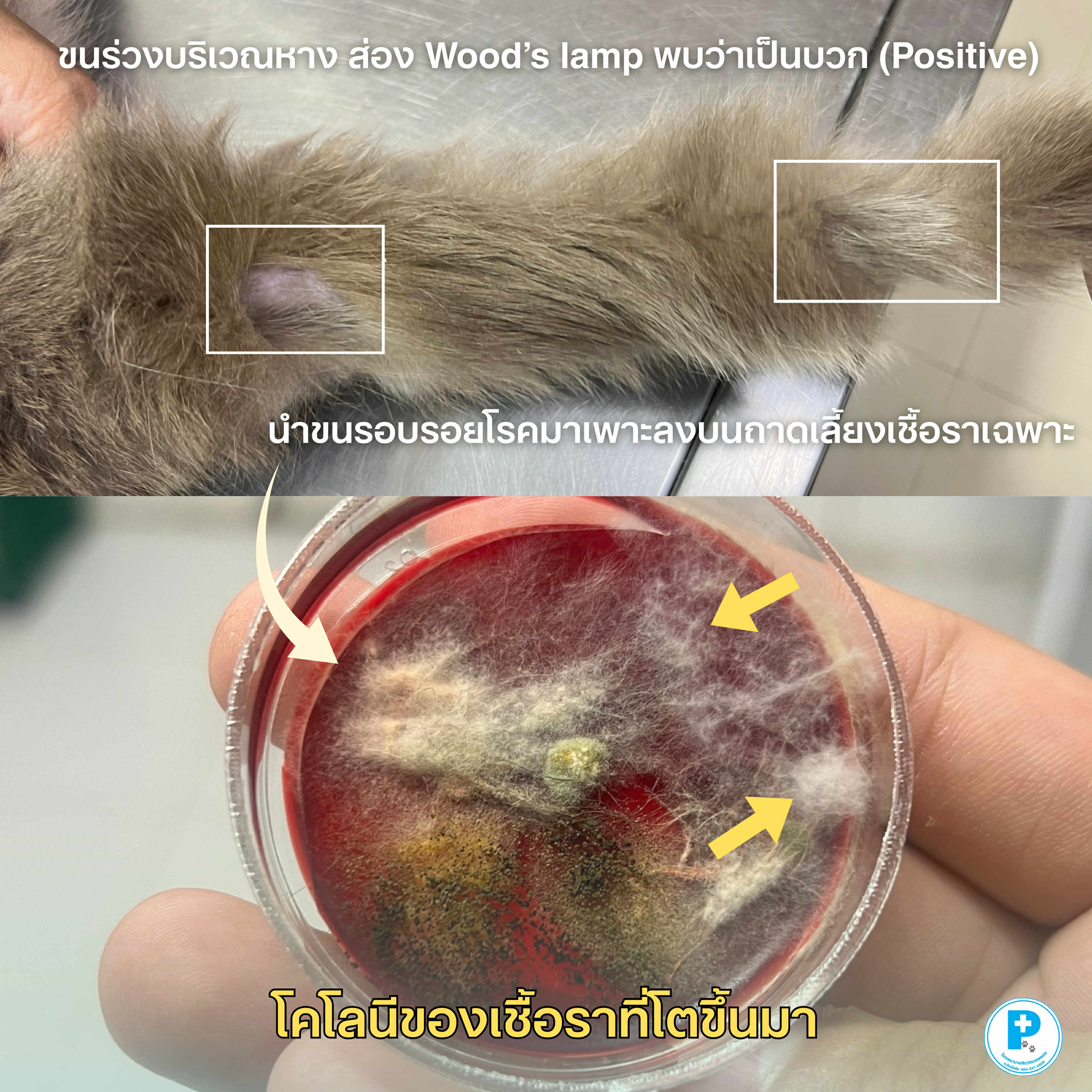 เก็บตัวอย่างขนไปเพาะเชื้อ และนำโคโลนีที่ขึ้นมาตรวจด้วยกล้องจุลทรรศน์ผลตรวจพบ Macroconidia