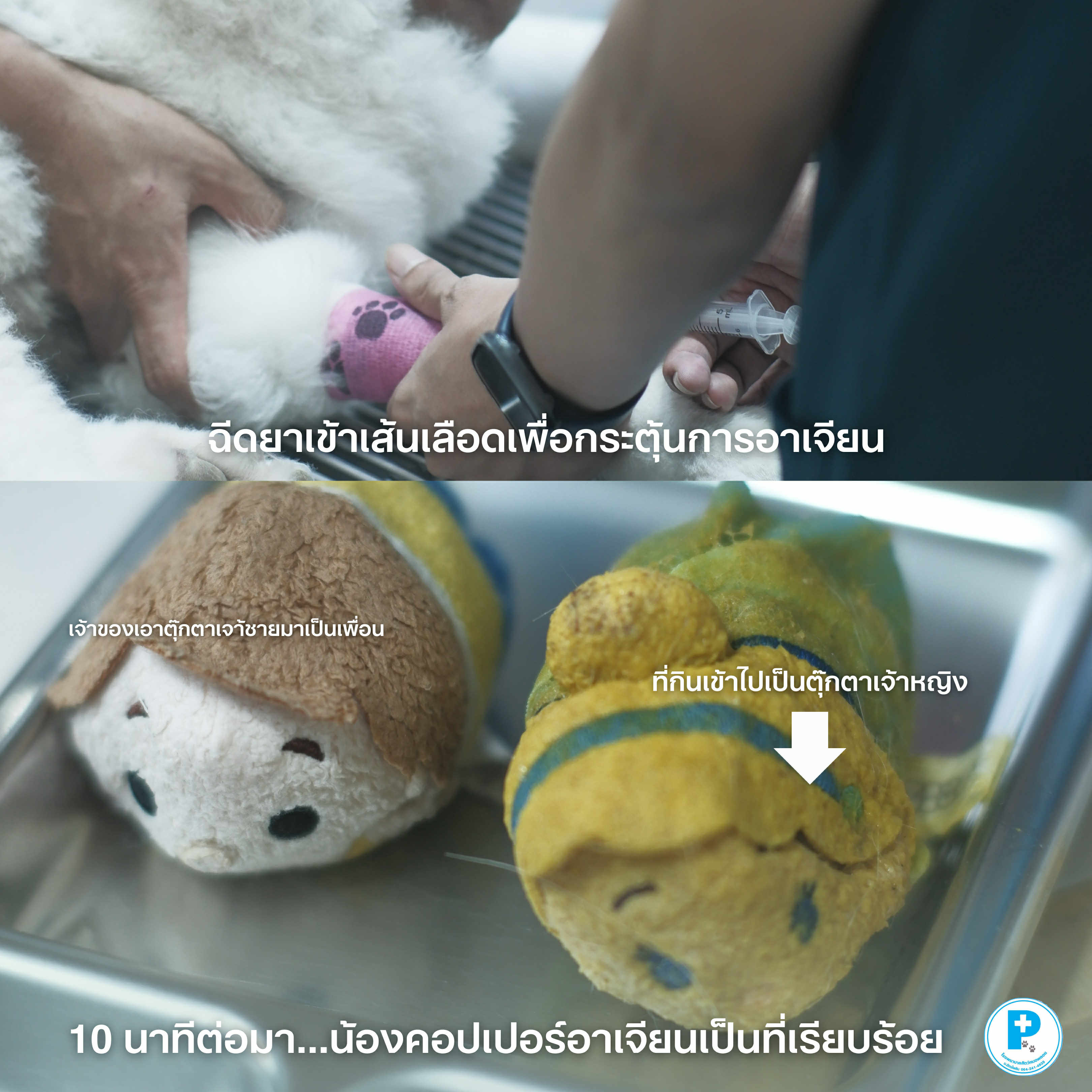 เจ้าของรีบพามาที่โรงพยาบาลทันที ตรวจเอ็กซ์เรย์พบว่า ตุ๊กตายังติดอยู่ในกระเพาะอาหาร โชคดีที่มาเร็ว ทำให้เราสามารถ ฉีดยากระตุ้นให้น้องอาเจียนออกได้สำเร็จภายใน 10 นาที ตุ๊กตาถูกคายออกมาครบ ไม่มีชิ้นส่วนค้าง ไม่ต้องผ่าตัด ไม่ต้องส่องกล้อง และน้องปลอดภัยแล้วครับ
