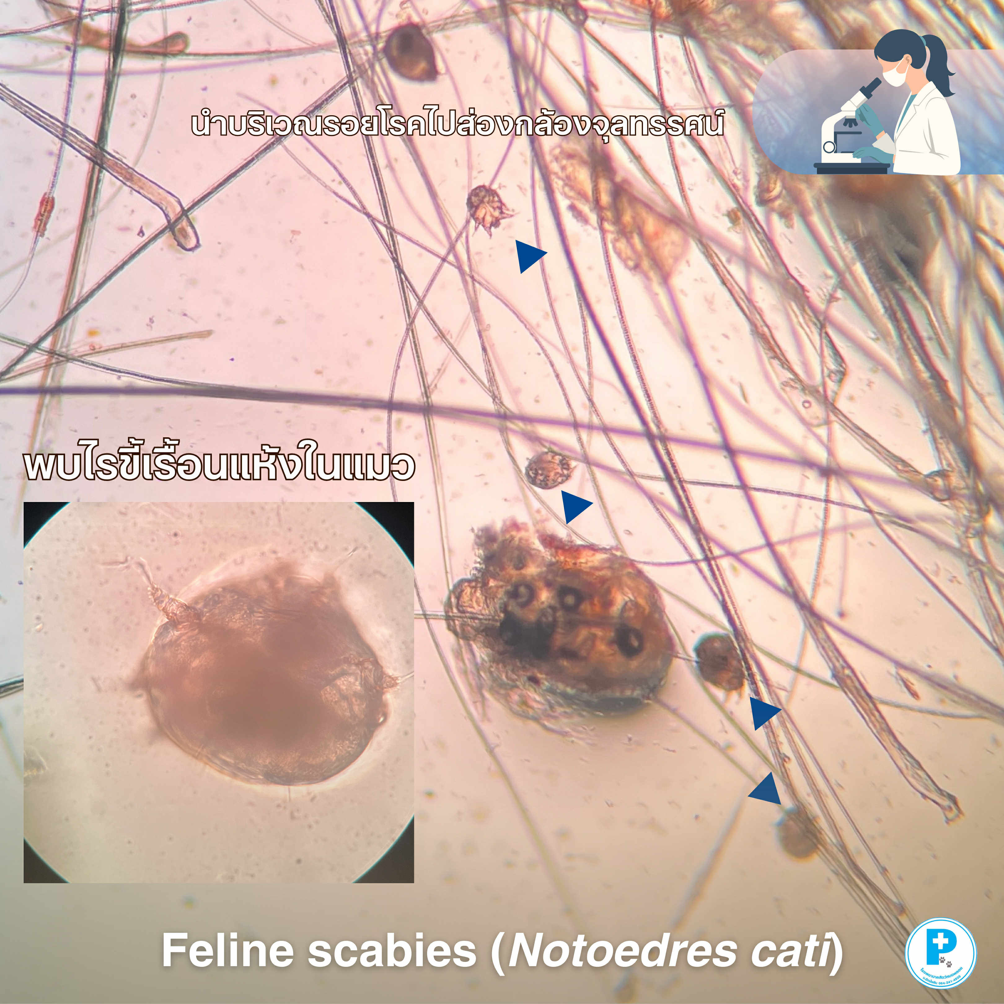 หลายครั้งเจ้าของสังเกตว่า “น้องขนร่วงเป็นวง ๆ” โดยเฉพาะ รอบตา ขอบปาก ขาหน้า พอซูมด้วยกล้องจุลทรรศน์ ก็เจอเจ้า Demodex sp. นอนแน่นเต็มรอยโรคเลย