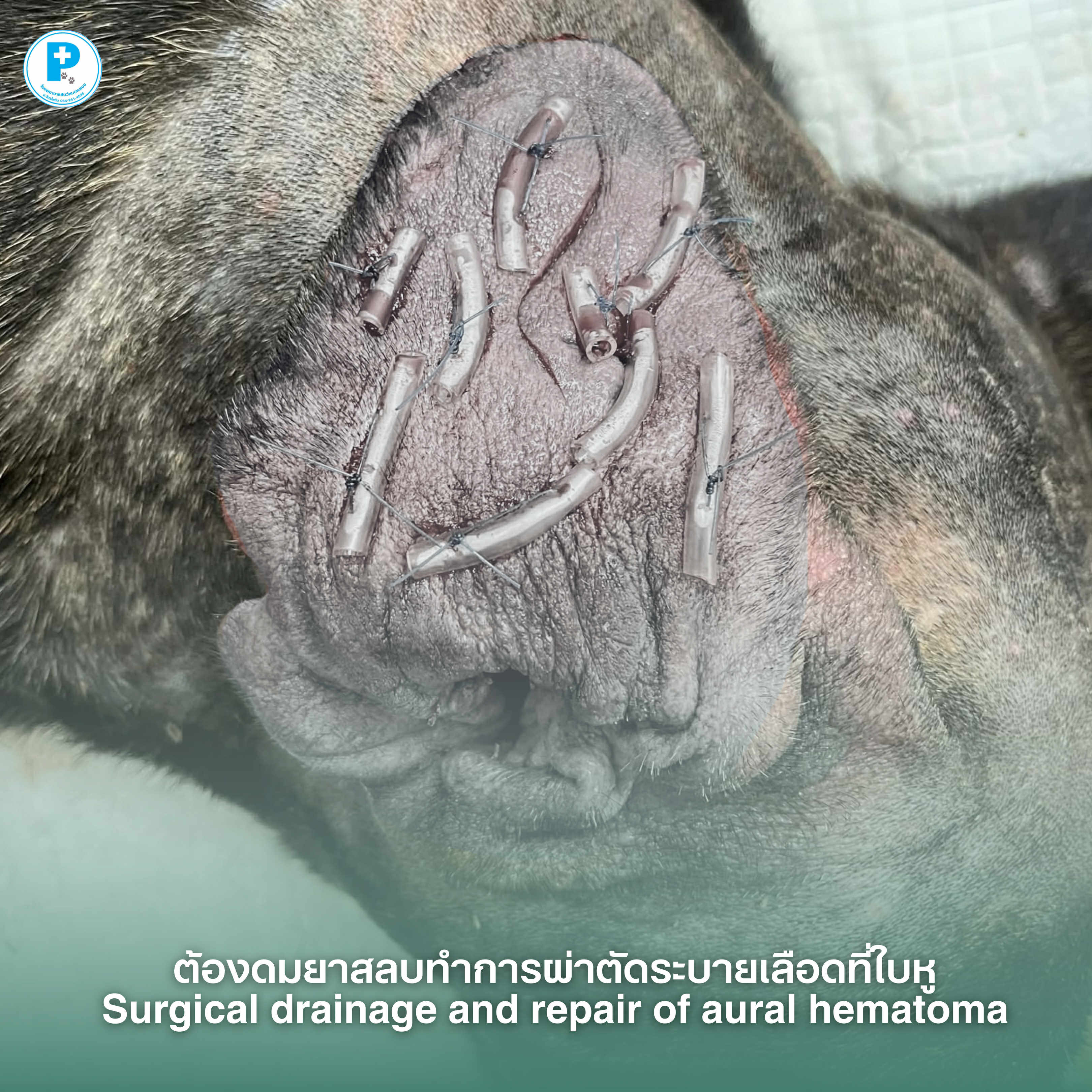การรักษาเคสนี้จำเป็นต้องวางยาสลบเพื่อผ่าตัดระบายเลือด และเย็บซ่อมใบหู (Surgical drainage and repair) เพื่อป้องกันการกลับมาคั่งซ้ำและลดความเสี่ยงหูย่นถาวร