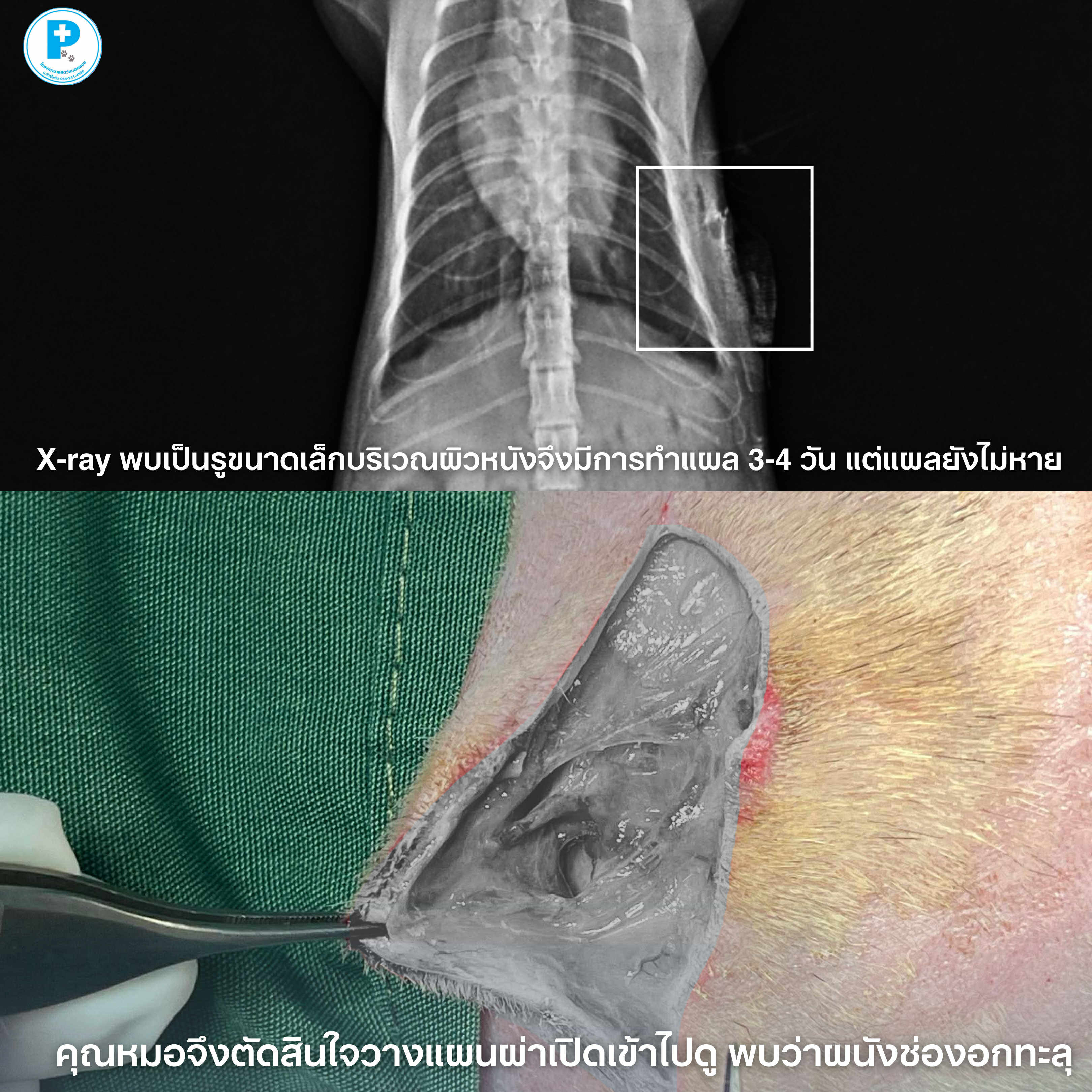 น้องกาฟิวส์โดนกัดที่ผิวหนังบริเวณช่องอกมา เมื่อเอกซเรย์ พบความผิดปกติของผนังช่องอก จากภายนอกเห็นเป็นแผลผิวหนังเล็กๆ แต่ ทำแผลมา 3–4 วันแล้วไม่ดีขึ้น คุณหมอจึงตัดสินใจ ผ่าตัดเปิดเข้าไปดู