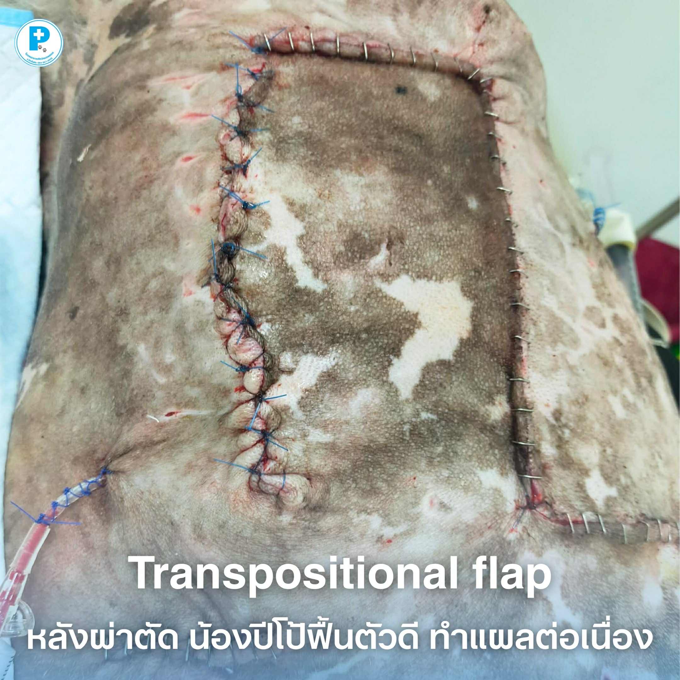 • เมื่อแผลสะอาดและพร้อม จึงทำการผ่าตัดปิดแผลด้วย Transitional flap เพื่อย้ายผิวหนังใกล้เคียงมาปิดแผล ลดแรงตึง และช่วยให้แผลหายดีขึ้น