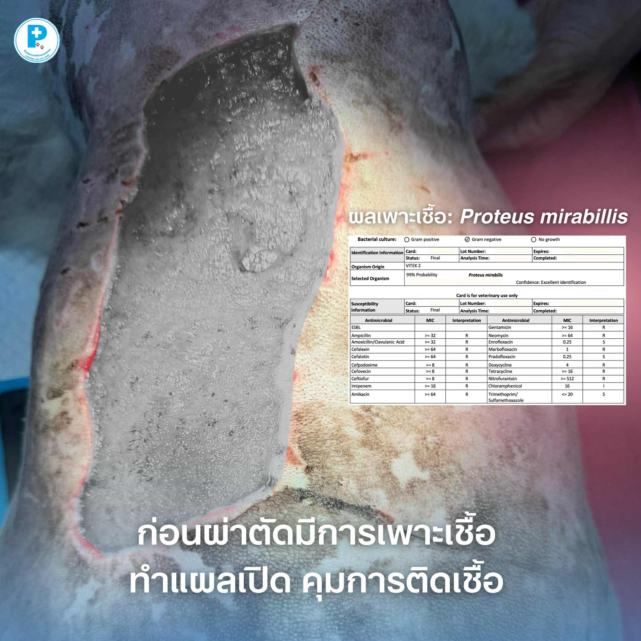 • เก็บตัวอย่างเพาะเชื้อ → พบเชื้อ Proteus mirabilis