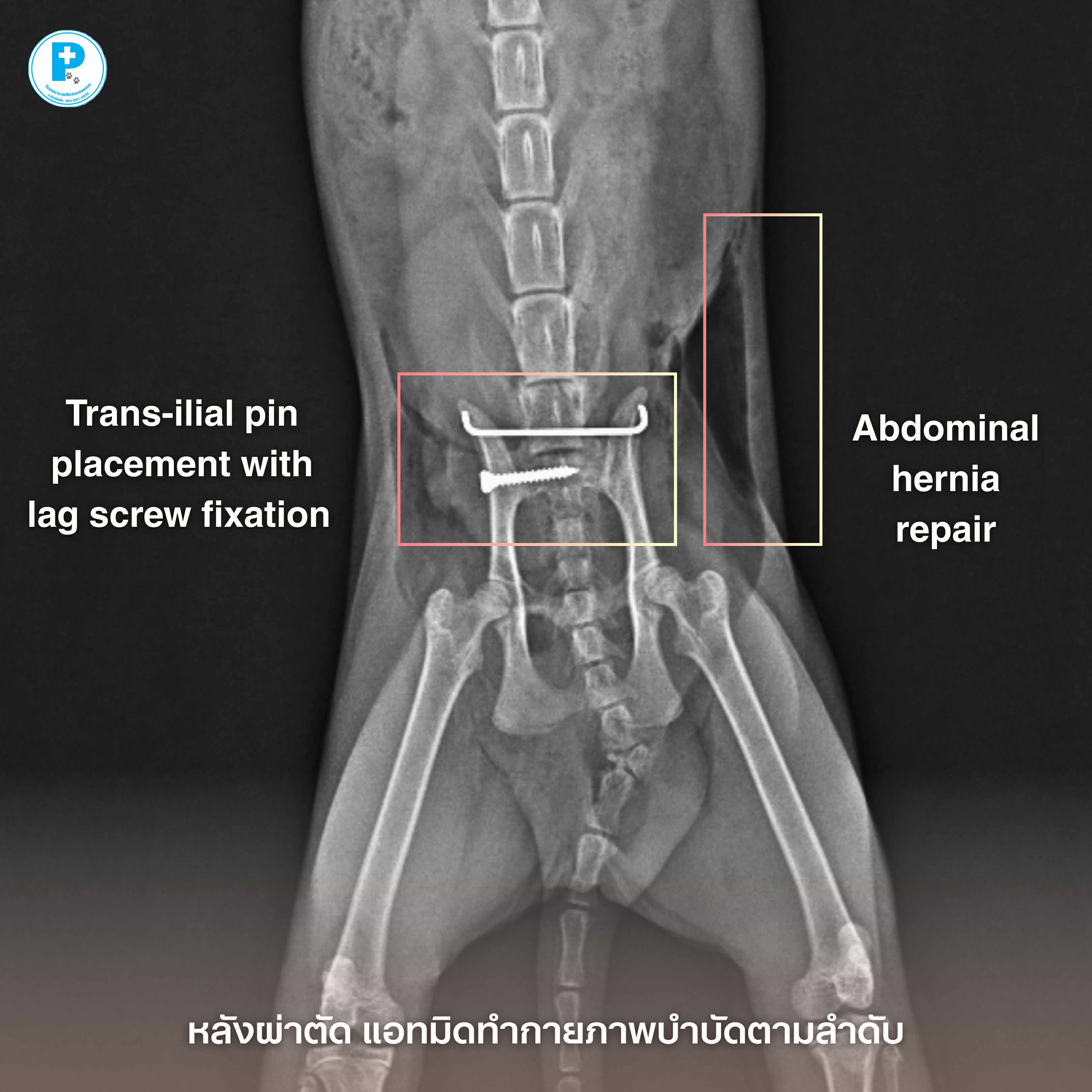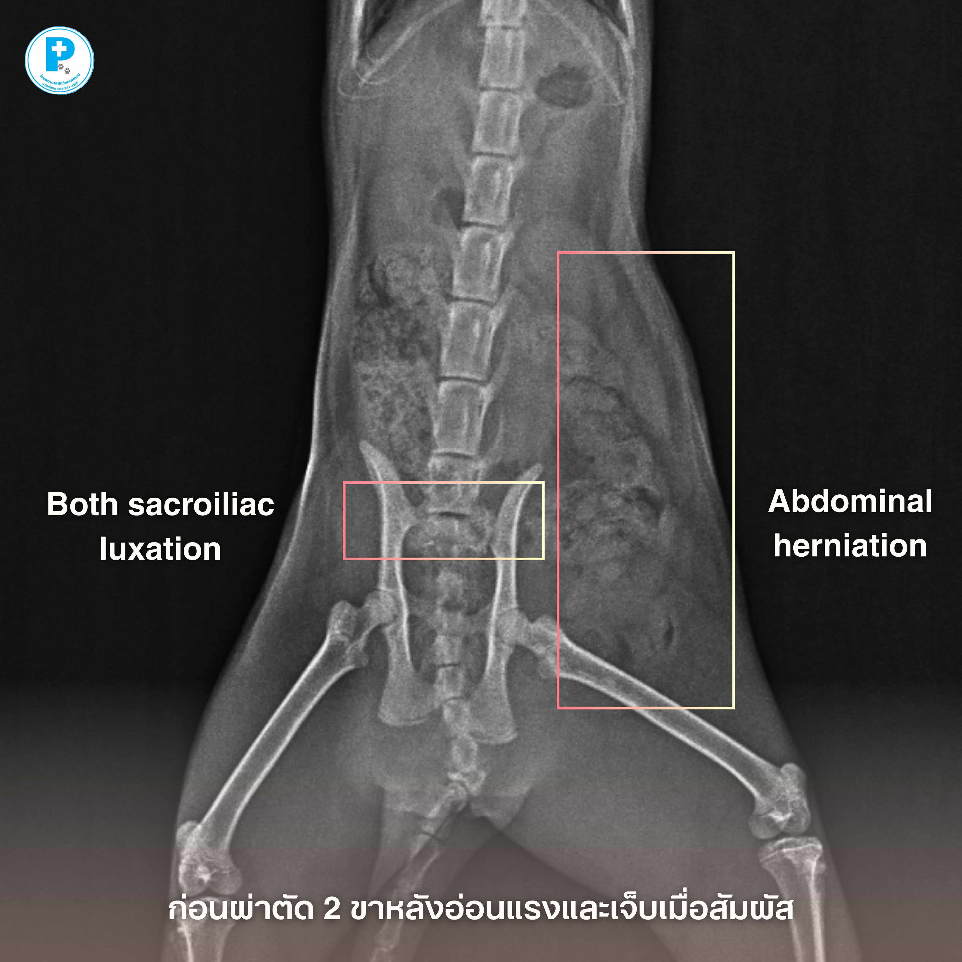 - น้องดำประสบอุบัติเหตุอย่างรุนแรง กระดูกเชิงกรานเคลื่อนทั้งสองข้าง (Both sacroiliac luxation) ร่วมกับภาวะไส้เลื่อนช่องท้อง (Abdominal herniation)