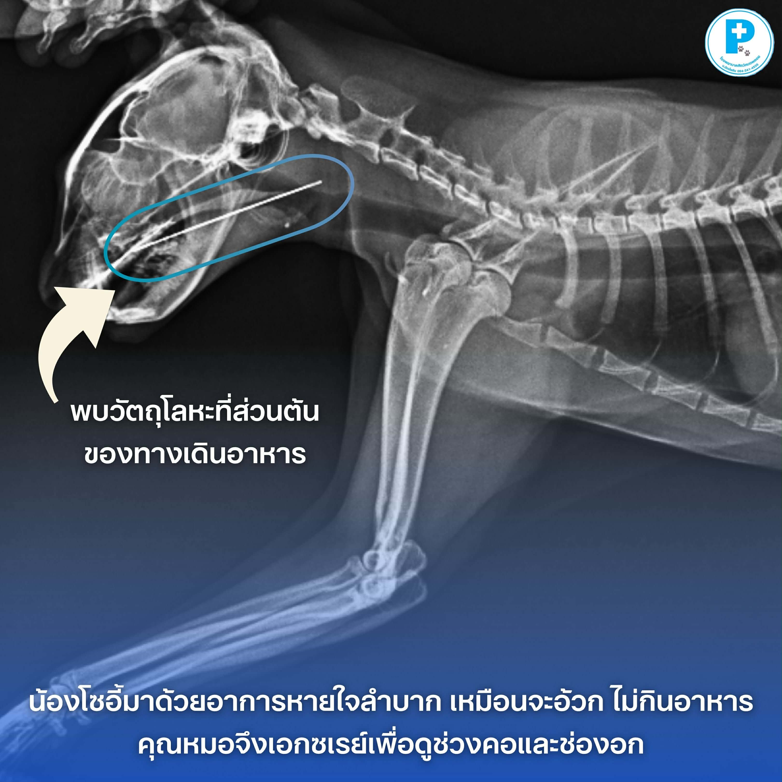 ไม่ยอมกินอาหารพอนำตัวเข้าตรวจและ X-ray อย่างละเอียด คุณหมอก็พบต้นเหตุที่น่าตกใจ คือ “วัตถุแปลกปลอมลักษณะยาวแหลม” ติดค้างอยู่ที่บริเวณส่วนต้นของทางเดินอาหาร (ช่วงคอ) ซึ่งพิจารณาแล้วคือ “เข็มเย็บผ้า” นั่นเองครับ!