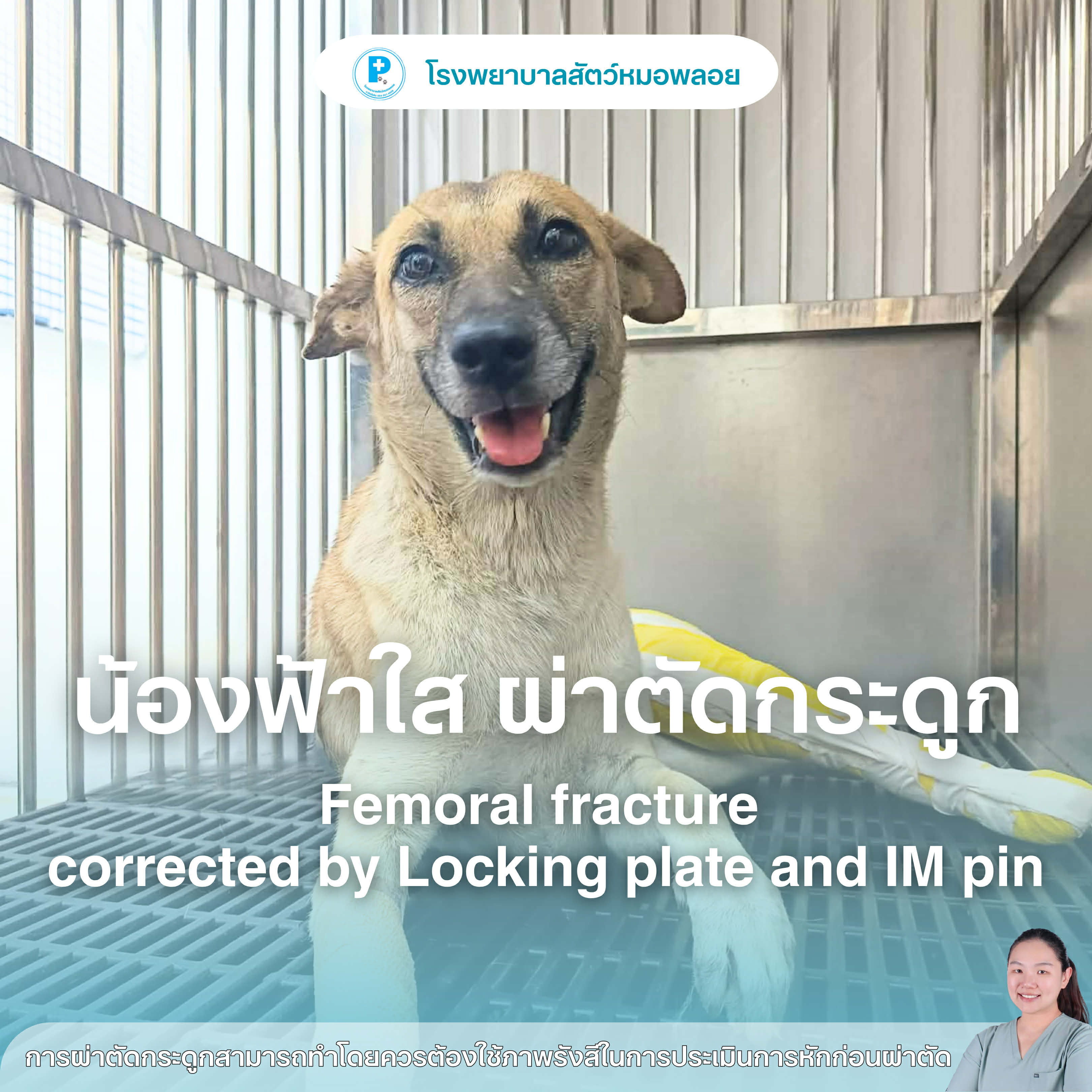 เคสนี้เป็นตัวอย่างที่ต้อง “เลือกวิธีผ่าตัดให้เหมาะกับขนาดและน้ำหนักสัตว์” เพื่อให้ผลลัพธ์ออกมาดีที่สุด ตอนนี้น้องพักฟื้นดีขึ้นเรื่อย ๆ แต่ยังต้องควบคุมการเคลื่อนไหว + ทำกายภาพต่อเนื่องครับผ่าตัด: สพ.ญ.ณัฐฐ์ธวรรณ โสภิพันธ์ (หมอพลอย)