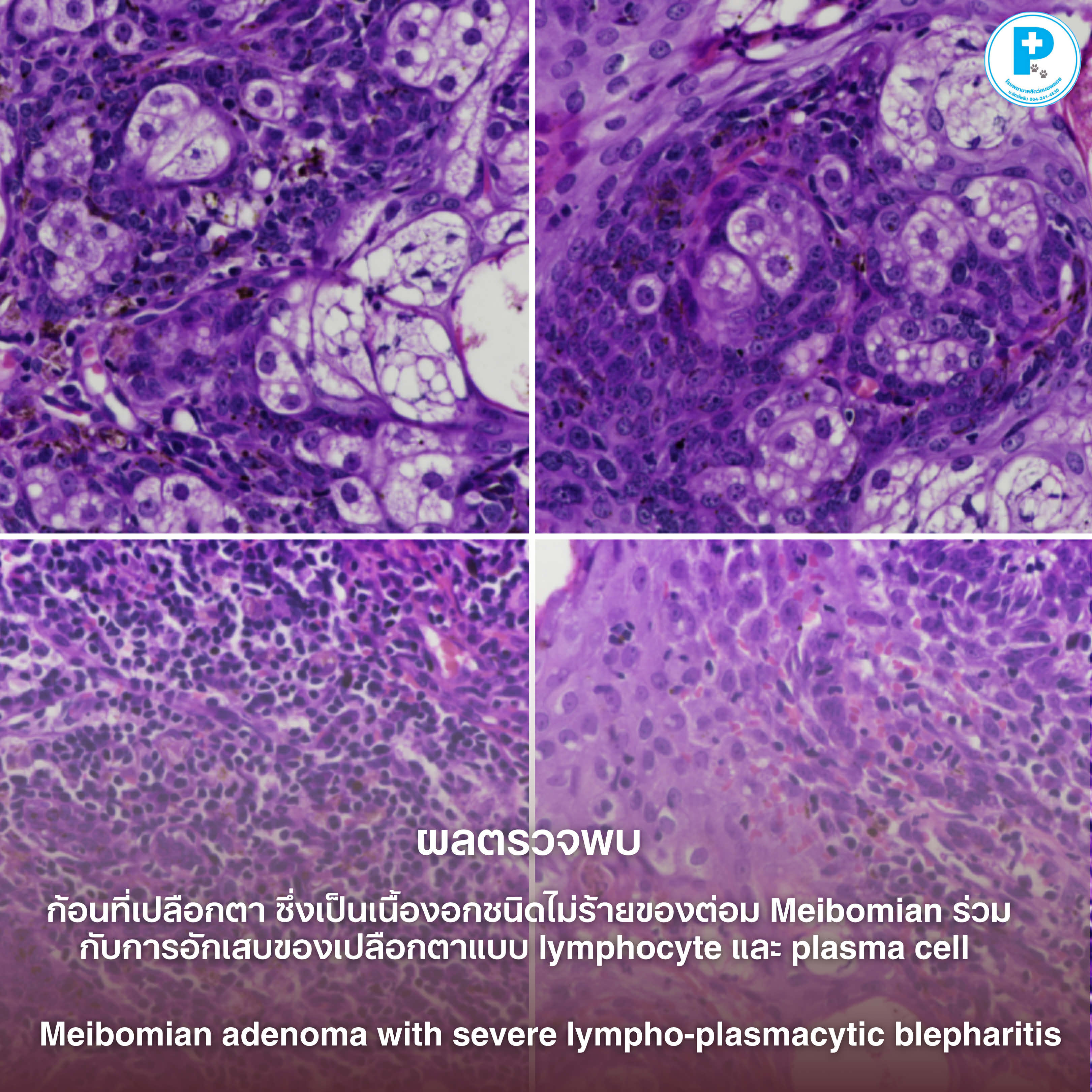 ผลตรวจพบว่าเป็นเนื้องอกชนิดไม่ร้ายแรงของต่อมไขมันที่เปลือกตา (Meibomian adenoma) แต่มีการอักเสบของเปลือกตาร่วมแบบ lymphocyte และ plasma cell (blepharitis)