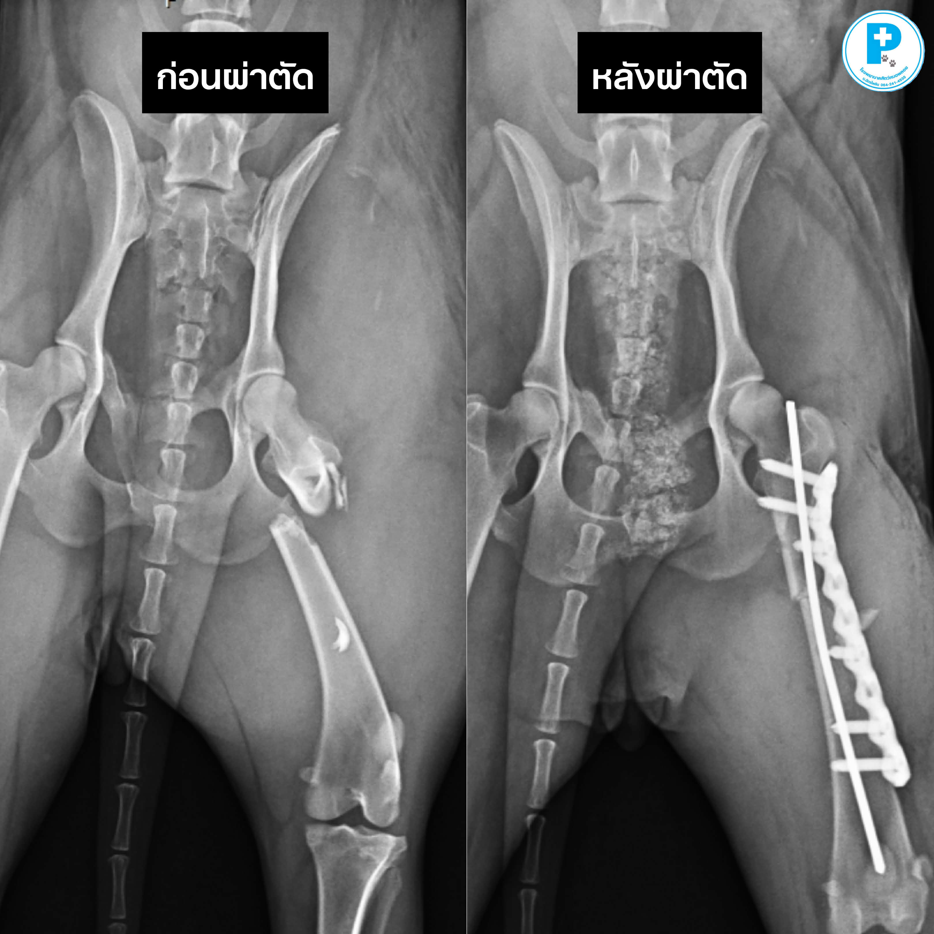 ภาพก่อน–หลังผ่าตัด จะเห็นการจัดแนวกระดูกที่ดีขึ้น และมีการยึดตรึงด้วย plate อย่างเหมาะสม