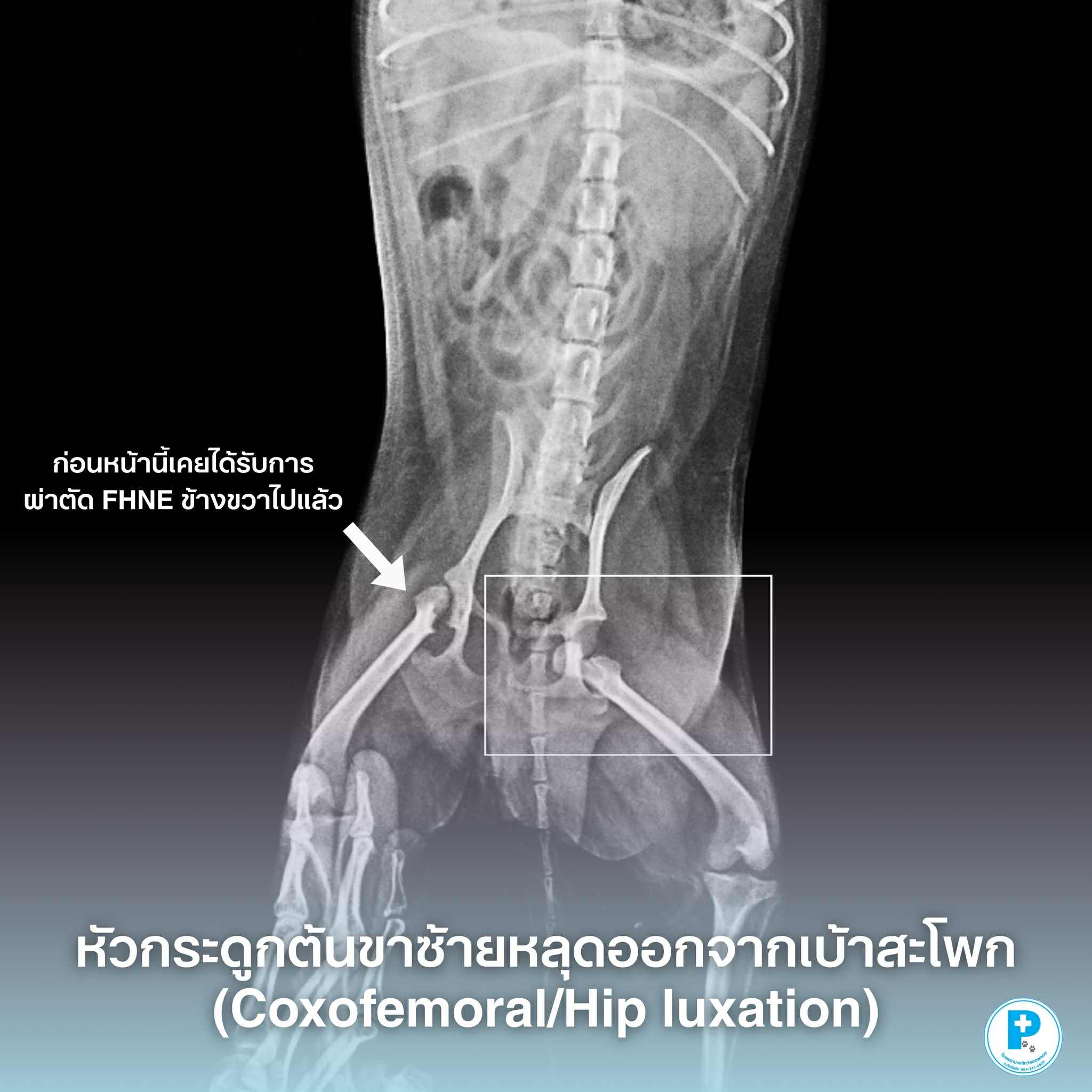 เคสนี้น้องหมาชื่อลูก้ามาด้วยอาการ ยกขาซ้าย เดินกะเผลก และแสดงอาการเจ็บขา ตรวจสอบประวัติพบว่า เคยผ่าตัดตัดหัวและคอกระดูกต้นขาด้านขวา (FHNE) มาก่อน