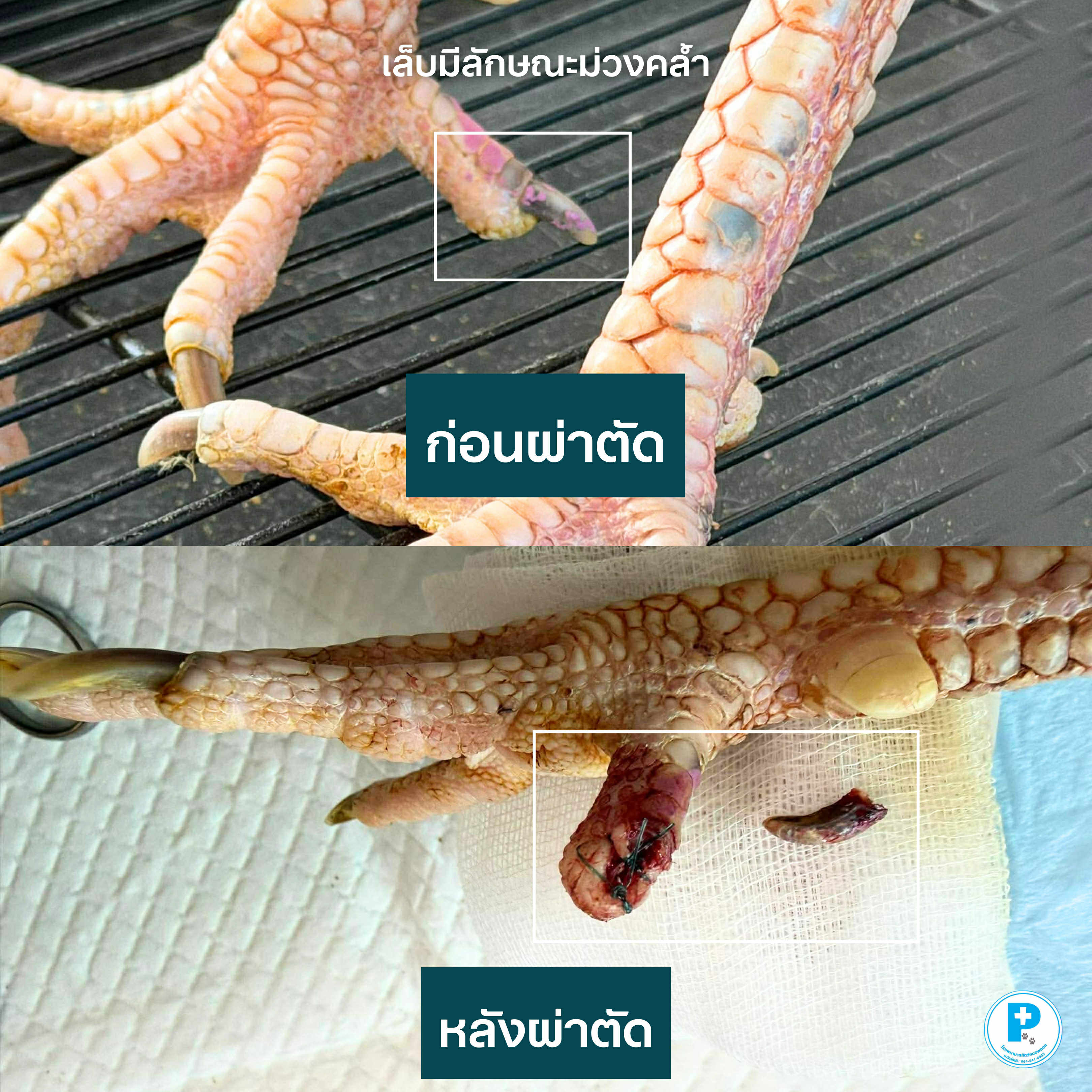 เคสนี้เป็นไก่ชนที่มีเล็บนิ้วเท้าขวาเกิดภาวะ เนื้อตาย เล็บม่วงคล้ำ แห้ง เปราะ และไม่สามารถใช้งานได้ตามปกติ หากปล่อยไว้เสี่ยงต่อการติดเชื้อ ลามเข้ากระดูก และทำให้เจ็บปวดเรื้อรัง