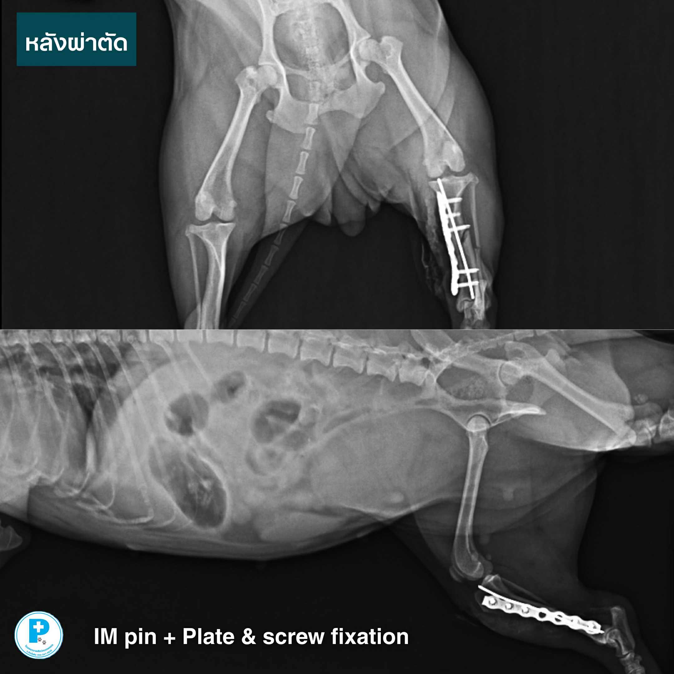 ทีมสัตวแพทย์จึงเลือกการรักษาด้วย IM pin ร่วมกับ Plate & screw fixation เพื่อเพิ่มความแข็งแรง ควบคุมแรงบิด และช่วยให้กระดูกเชื่อมติดได้อย่างปลอดภัย