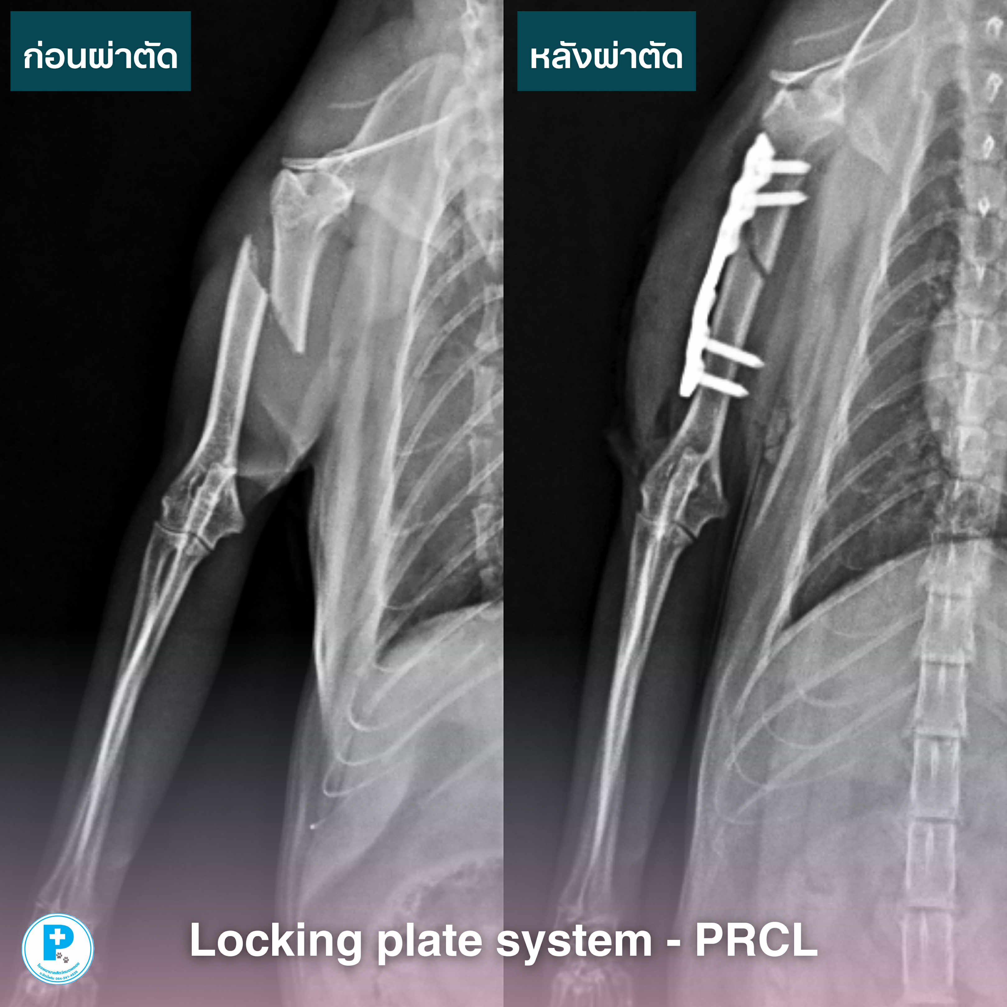 ทีมสัตวแพทย์เลือกทำการผ่าตัดด้วย Locking Plate System (PRCL) เพื่อให้กระดูกยึดแน่น แข็งแรง และช่วยให้น้องสามารถกลับมาใช้งานขาได้เร็วและปลอดภัยที่สุด ![]()