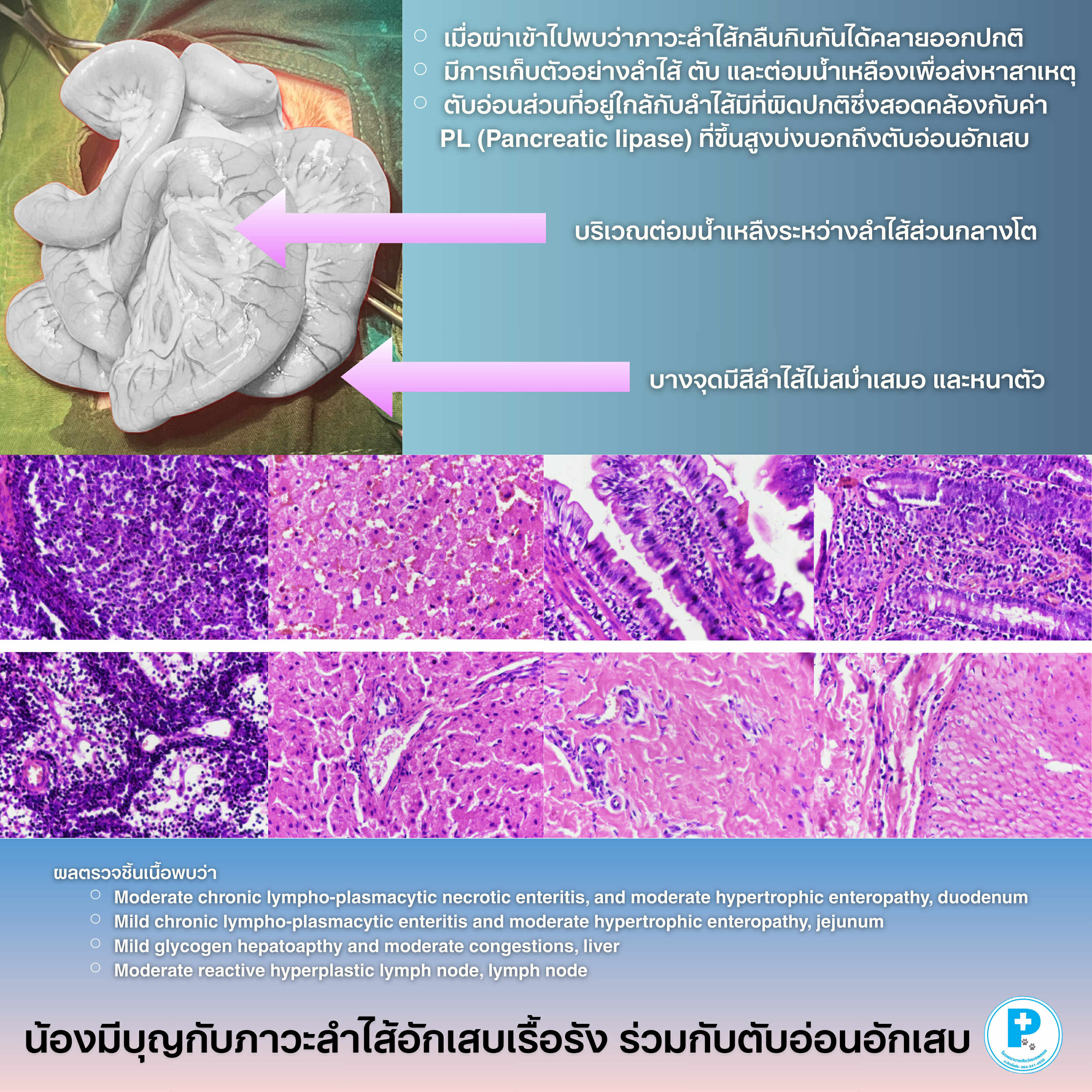 น้องมาด้วยอาเจียนต่อเนื่องหลายวัน กินยาแล้วไม่ดีขึ้นอัลตราซาวนด์พบว่าลำไส้หนาผิดปกติ ต่อมน้ำเหลืองโต และมีช่วงหนึ่งเหมือนลำไส้กลืนกัน (intussusception) จึงตัดสินใจผ่าตัดสำรวจช่องท้อง