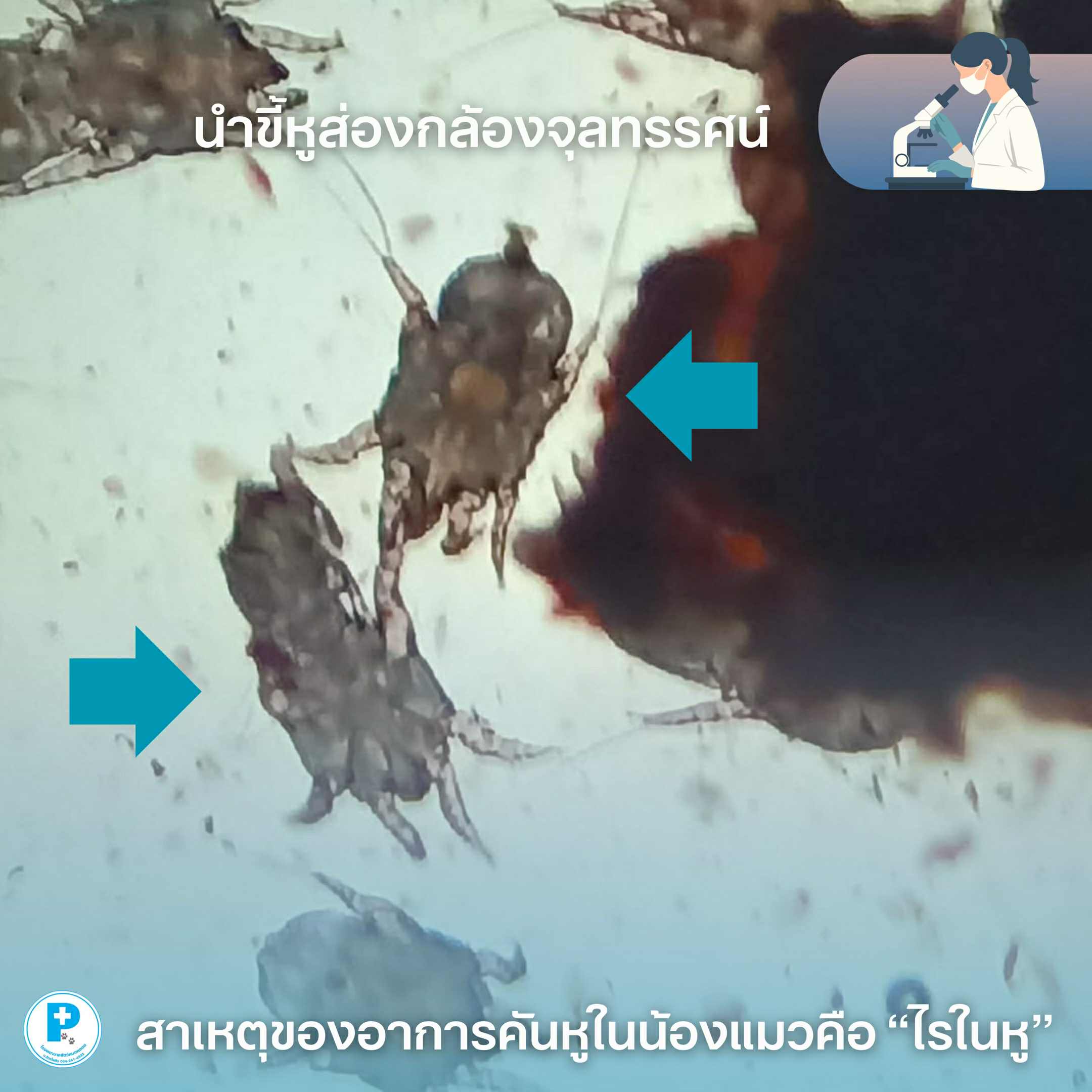 น้องอั่งเปามาด้วยอาการคันหู ตรวจในช่องหูพบขี้หูสีดำคล้ายกากกาแฟ ส่องกล้องจุลทรรศน์เจอตัวการชัดเจน — “ไรในหู (Ear mite)”