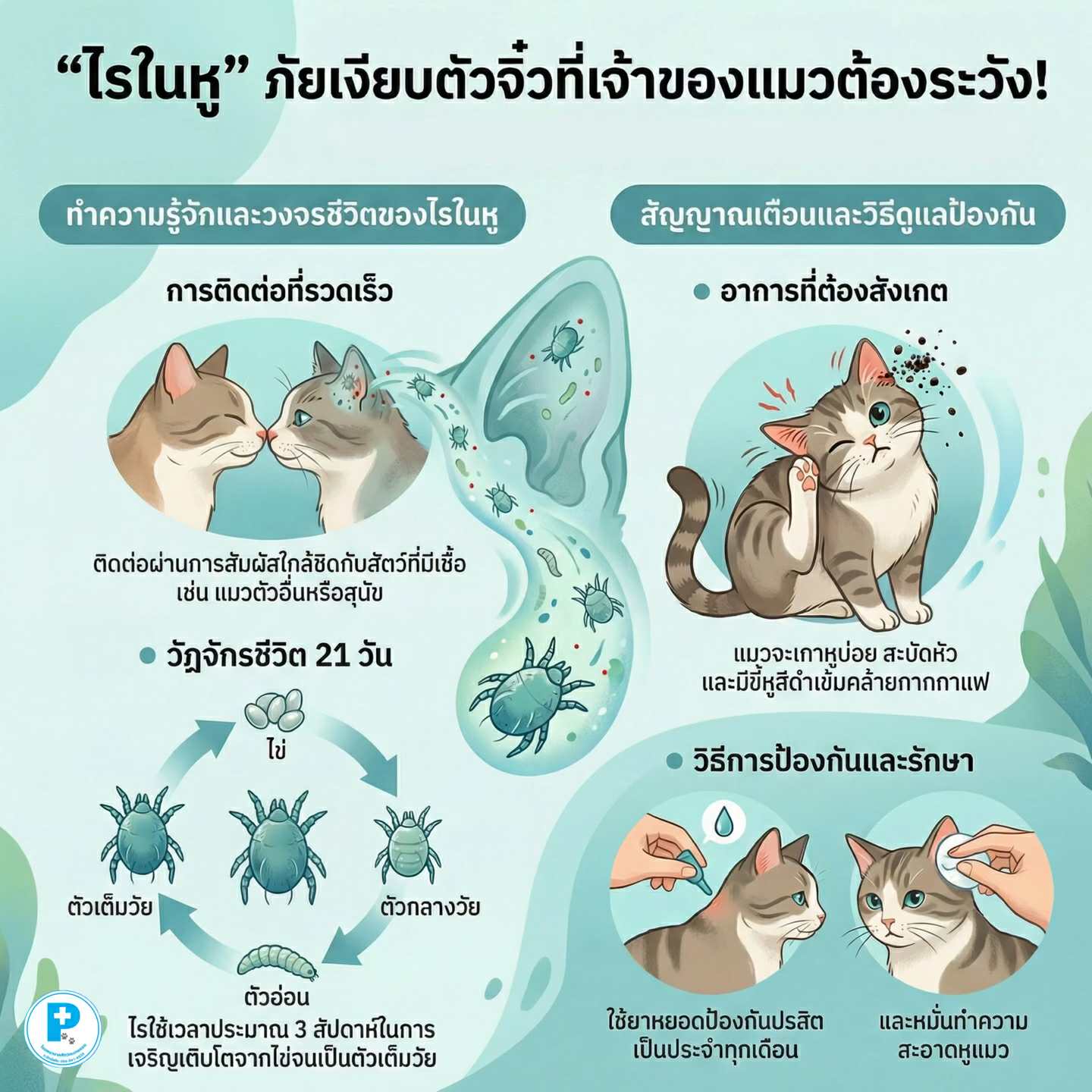 ไรในหูเป็นปรสิตขนาดเล็ก อาศัยอยู่ในช่องหู ติดต่อได้ง่ายมากผ่านการสัมผัสใกล้ชิด โดยเฉพาะลูกแมวหรือแมวที่อยู่รวมกันหลายตัว