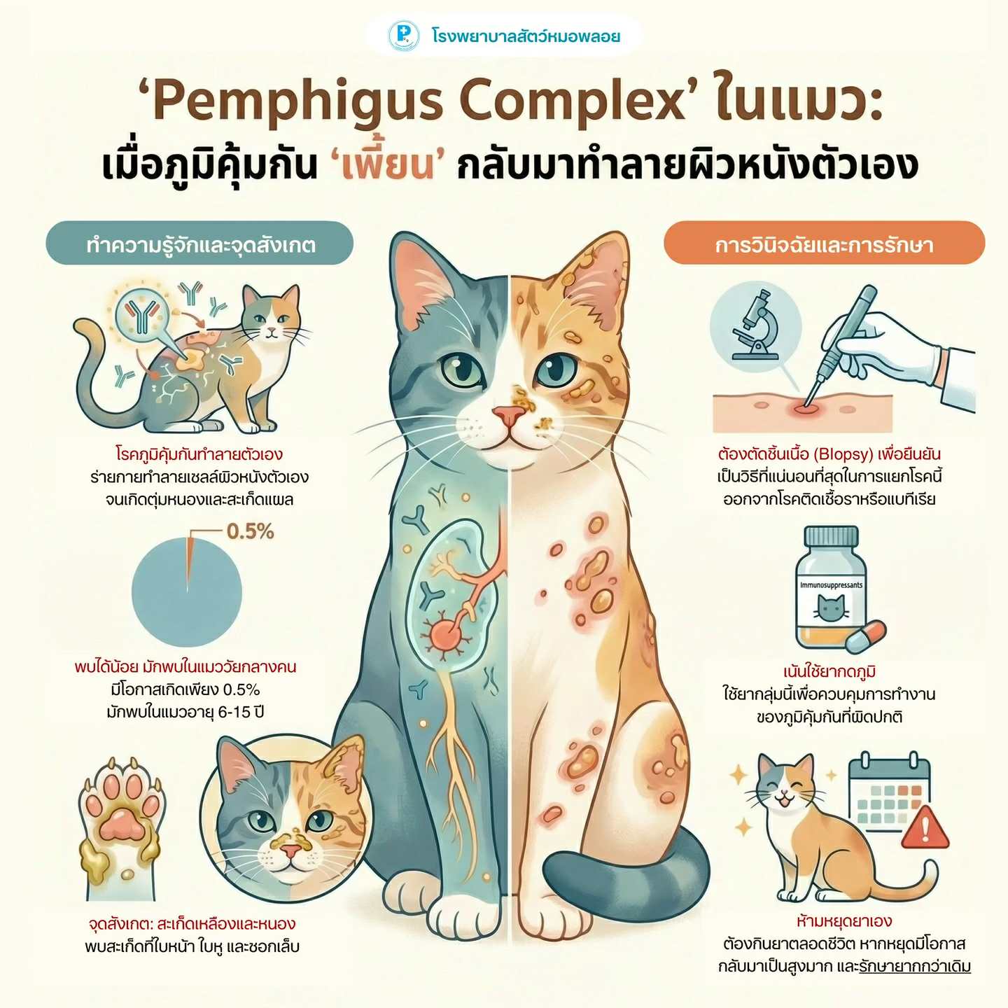 ข้อสำคัญ ไม่ควรหยุดยาเอง เพราะโรคมีโอกาส กลับมาเป็นซ้ำสูง และอาจรักษายากกว่าเดิม หากพบความผิดปกติของผิวหนังในสัตว์เลี้ยง ควรพามาตรวจเพื่อวินิจฉัยและรักษาอย่างเหมาะสม