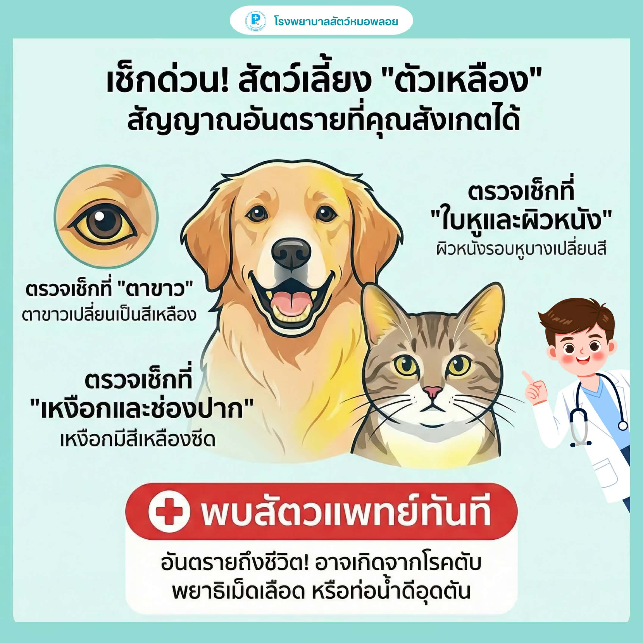 สำคัญที่สุดคือ ตัวเหลืองไม่ใช่โรค แต่เป็น “สัญญาณของโรค” ยิ่งพามาตรวจเร็ว โอกาสรักษาหายยิ่งสูง แต่บางครั้ง หากมาไม่ทันเวลา ตัวโรครุนแรงอาจทำให้สัตว์เสียชีวิตได้