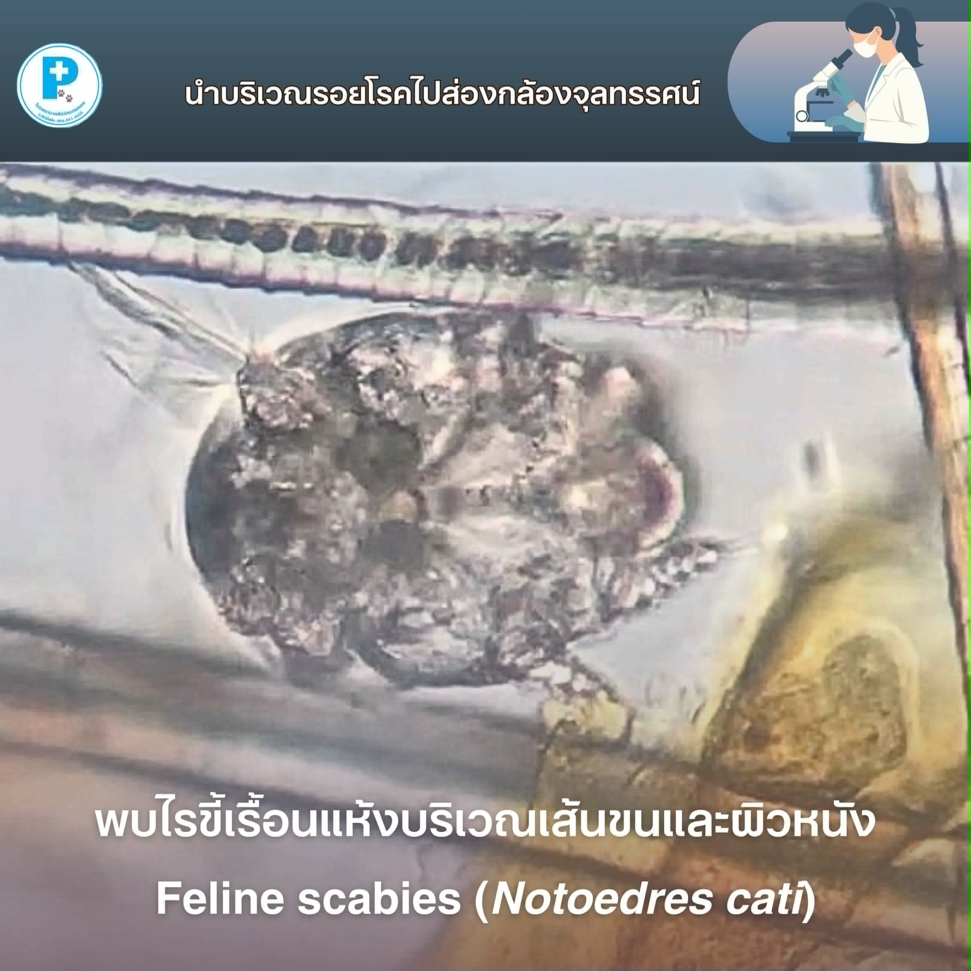 จากการส่องกล้อง เราพบตัวการชัดเจนคือ ไรขี้เรื้อนแห้ง (Notoedres cati) หรือ Feline Scabies ที่กำลังชอนไชอยู่บริเวณเส้นขนและผิวหนังของน้องมีอาครับ